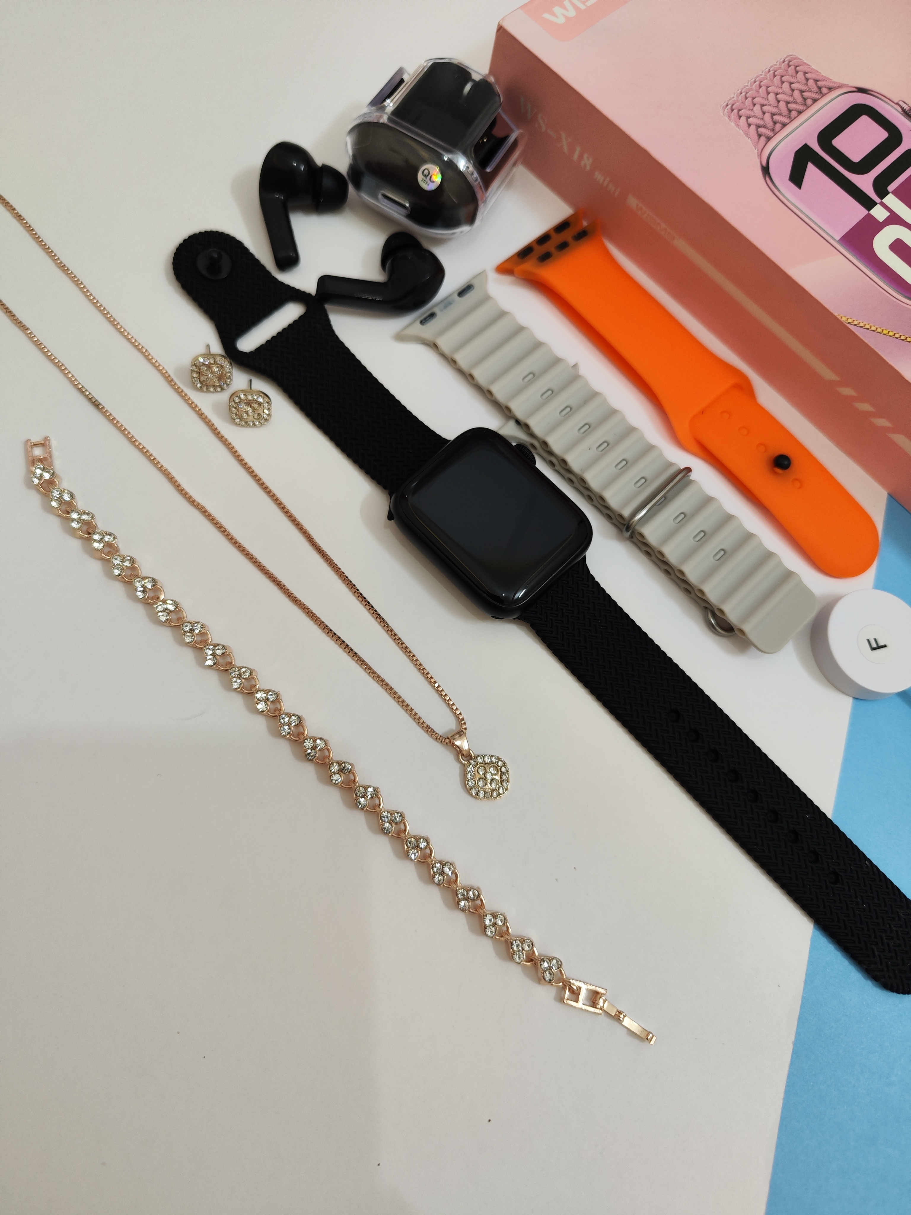 پک کامل ساعت هوشمند مینی WS-X18Mini + ایرپاد و ست جواهرات نگینی